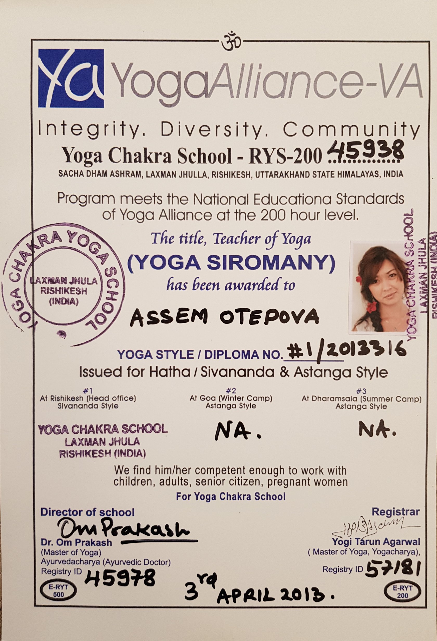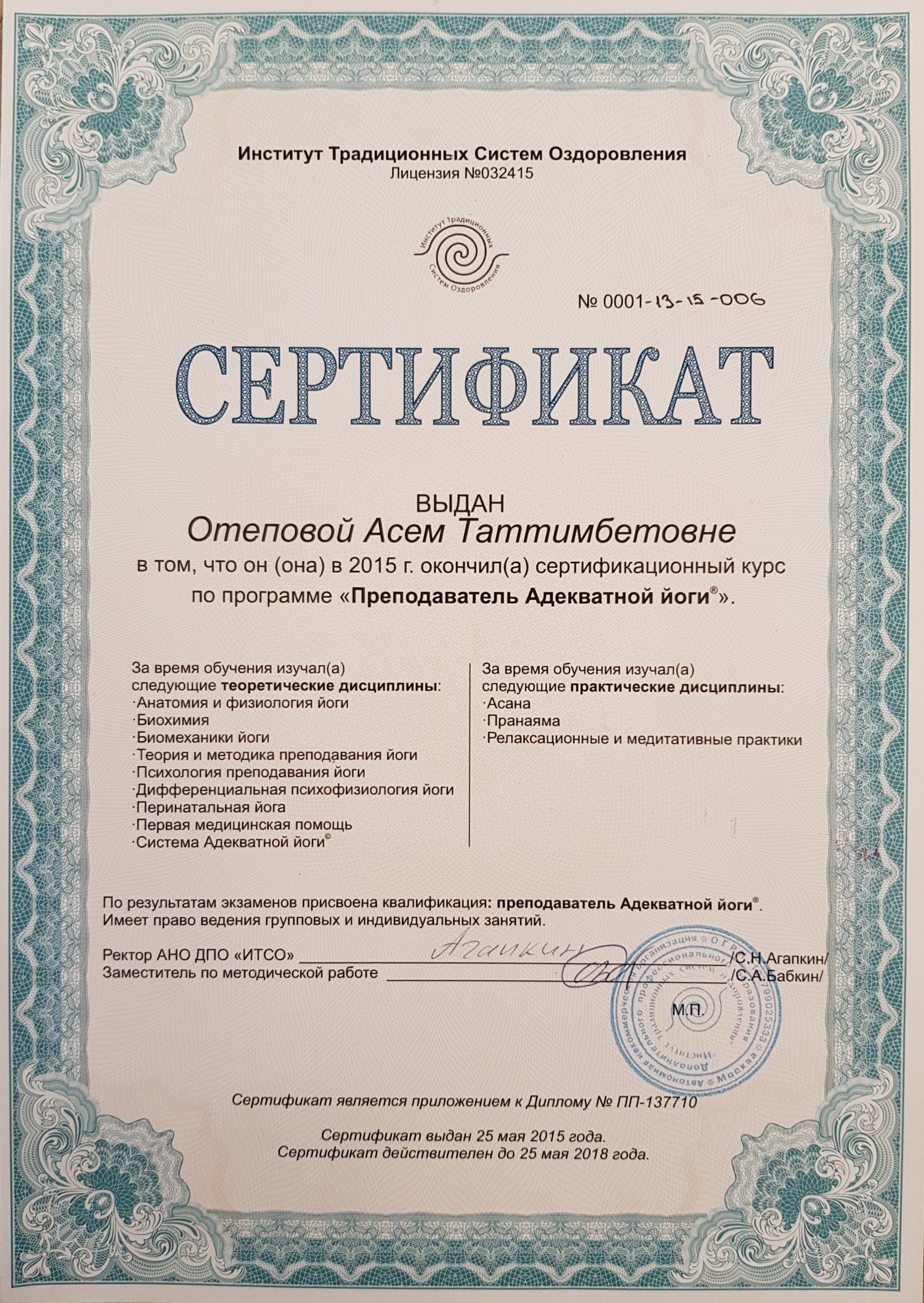 Сертифицированный преподаватель по хатха и шивананда йоге (Индия, Франция, Польша, Россия). Выпускница института традиционных систем оздоровления (Москва). Сертифицированный диетолог, выпускник Института междисциплинарных исследований г. Гановер, кафедра диетологии, курс нутрициологии.
